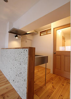 素材の多くに天然素材を使用。床には無垢のフローリングを貼り、ひときわ目を引くのはキッチンの腰壁の大谷石。